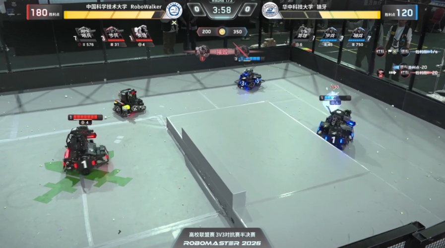 在竞争最为激烈的3V3对抗赛中,我校RoboWalker战队表现出强大的战斗力。战队在小组赛与淘汰赛阶段先后战胜多支强队,强势闯入四强。半决赛中,队员们凭借精准的视觉识别算法和稳定的机械结构,以2:0完胜老牌劲旅华中科技大学战队。决赛对阵合肥工业大学(宣城校区)战队时,队员们沉着应战,最终成功问鼎冠军。
